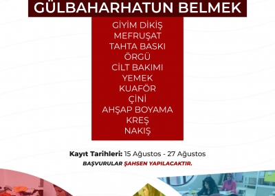 Gülbaharhatun BELMEK: Giyim Dikiş, Mefruşat, Tahta Baskı, Örgü, Cilt Bakımı, Yemek, Kuaför, Çini, Ahşap Boyama, Kreş, Nakış.