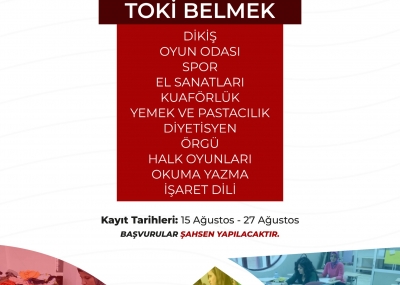 TOKİ BELMEK: Dikiş, Oyun Odası, Spor, El Sanatları, Kuaförlük, Yemek ve Pastacılık, Diyetisyen, Örgü, Halk Oyunları, Okuma Yazma, İşaret Dili.
