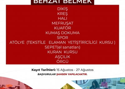 Behzat BELMEK: Dikiş, Kreş, Halı, Mefruşat, Kuaför, Kumaş Dokuma, Spor, Atölye (Tekstile Eleman Yetiştiriciliği Kursu), Sepet (El Sanatları), Kuran Kursu, Aşçılık, Örgü.