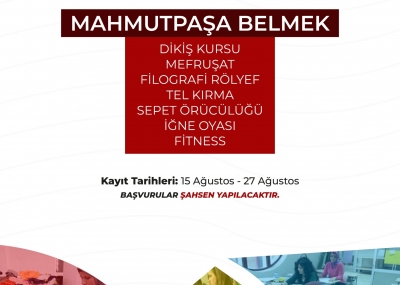 Mahmutpaşa BELMEK: Dikiş Kursu, Mefruşat, Filografi Rölyef ve Tel Kırma, Sepet Örücülüğü, İğne Oyası, Fitness.