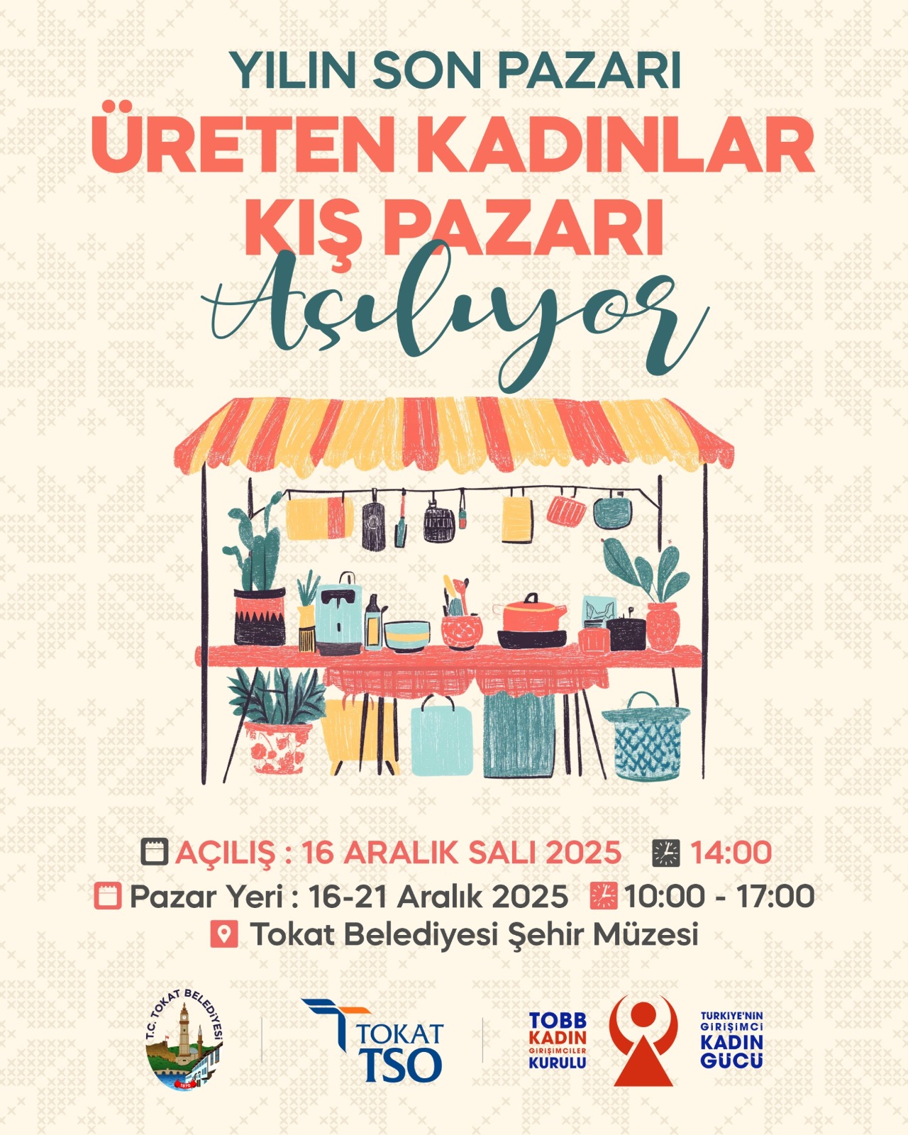 Tokat Belediyesi’nin öncülüğünde; Tokat Ticaret ve Sanayi Odası, TOBB Tokat Kadın Girişimciler Kurulu ve Türkiye’nin Kadın Gücü kuruluşunun iş birliğiyle düzenlenen “Yılın Son Pazarı: Üreten Kadınlar Kış Pazarı”, 16–21 Aralık 2025 tarihleri arasında Tokat Belediyesi Şehir Müzesi’nde vatandaşlarla buluşuyor.